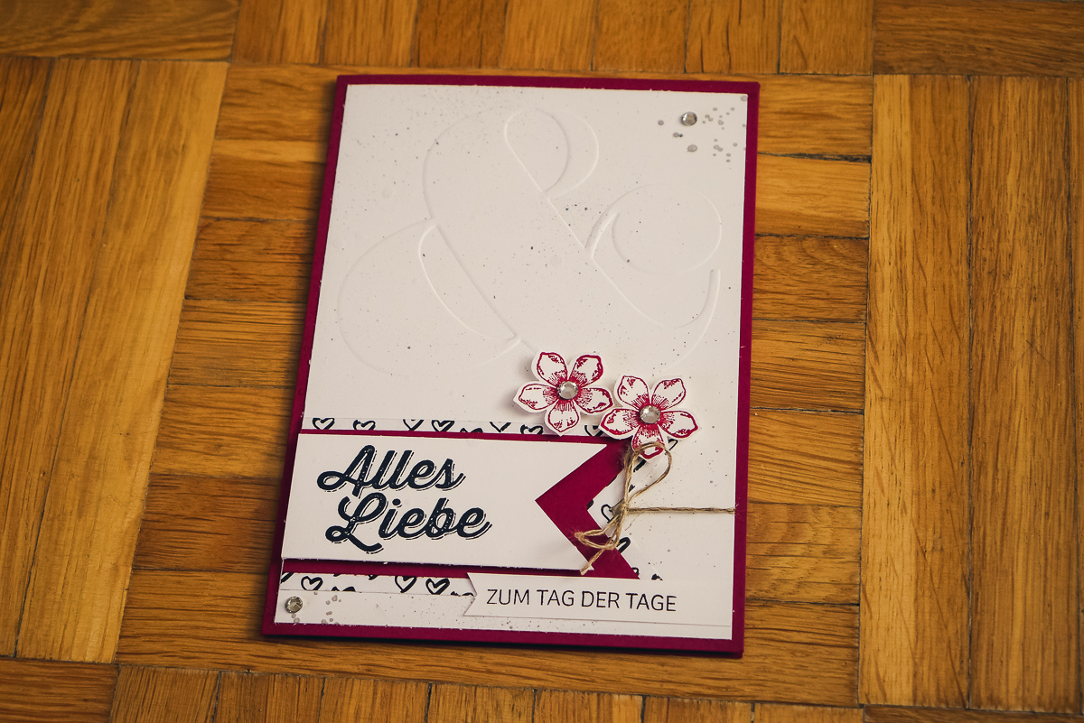 Passend zu unserem Geschenk habe ich eine Karte gebastelt und dafür sogar etwas Papier mit Herzchen gefunden. Normal für meinen Geschmack zu kitschig, aber bei einer Hochzeit darf das ruhig schon mal sein.
